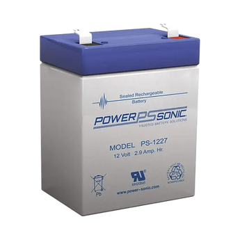 La Batería 12V, 2.9AH, PS-1227-F1 de POWER SONIC es ideal para respaldo de energía en sistemas de seguridad. Sus características incluyen terminales F1, un voltaje nominal de 12V y 5 años de vida útil. Este modelo es libre de mantenimiento, cuenta con tecnología AGM y VRLA, y es certificado por UL. Su peso es de solo 1.1 kg y sus dimensiones son 3.11” x 2.20” x 3.90”.