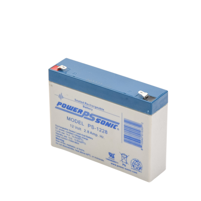 Batería 12V, 2.8AH PS-1228 de POWER SONIC, terminales F1 y diseño libre de mantenimiento con 5 años de vida útil. Voltaje Nominal: 12V, Capacidad: 2.80 AH @20HR, Peso: 1.2 kg y dimensiones de 5.24%22 x 1.30%22 x 3.82%22. Ideal para respaldo en sistemas de seguridad y emergencia.