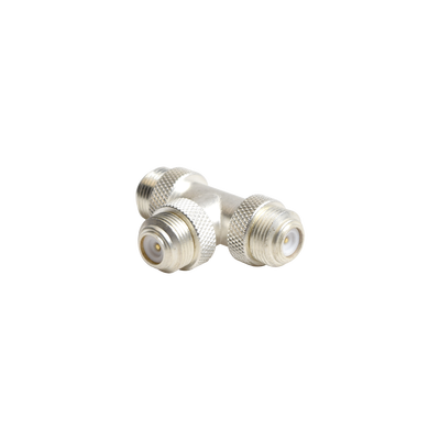 El Adaptador triple UNIDAPT Macho en T PT-4000-027 de RF INDUSTRIES, LTD. es un conector universal fácil de ensamblar, fabricado con bronce maquinado chapado en plata y contactos centrales de bronce fosforoso chapado en oro. Su dieléctrico es de teflón, lo que garantiza alta calidad de señal. Este adaptador versátil permite mezclar y combinar accesorios Unidapt ™, facilitando conexiones intuitivas para técnicos y profesionales del audio y video.