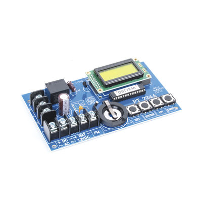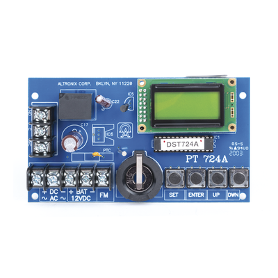 Temporizador tarjeta PT724A 12-24 Vca/Vcc 50 eventos 365 días pantalla LCD. Ideal para programación de hasta 50 eventos y 10 fechas de vacaciones. Especificaciones: Alimentación: 12 - 24 Vca/Vcc, Relevador Tipo \%27C\%27 de 10 A a 120 Vca / 28 Vcc, corriente en espera de 10mA (apagado), rango de temperatura de -20°C a 49°C. Facilita la programación mediante su pantalla LCD y protege datos de fallas de energía.