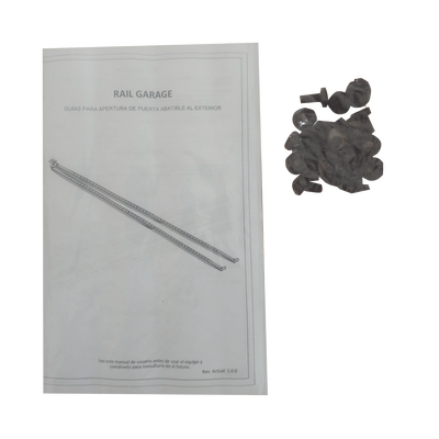 Guías para apertura de puertas RAIL-GARAGE rieles ajustables de 2.80 a 5 mts, compatible con motor ACCESSFORCE. Incluye manual de instalación y es un kit completo con todos los componentes. Con rieles ajustables y materiales duraderos, este sistema facilita la automatización de puertas abatibles al exterior.