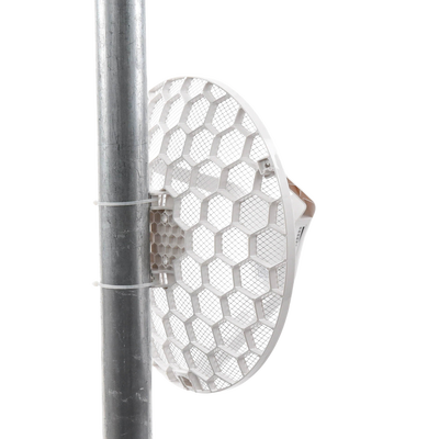 Dispositivo inalámbrico RBLHG-5ND 5 GHz 300 Mbit/s antena 24 5 dBi diseño de rejilla, ideal para enlaces punto a punto. Con código RBLHG-5nD, CPU AR9344 a 600 MHz, antena de 24.5 dBi, y capacidad de hasta 316mW de potencia.