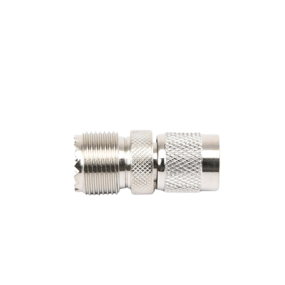 Adaptador en línea RFT-1235 TNC a UHF níquel oro teflón alta calidad fácil instalación. Conectores de alta calidad, cuerpo de bronce niquelado, contacto central de oro y aislante de teflón. Compatible con sistemas de comunicación de radio, fácil instalación y mejora la calidad de la señal transmitida.