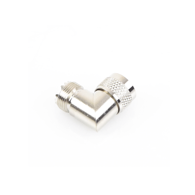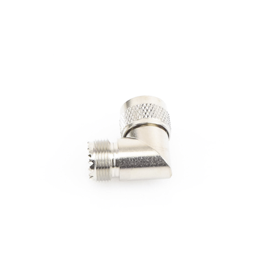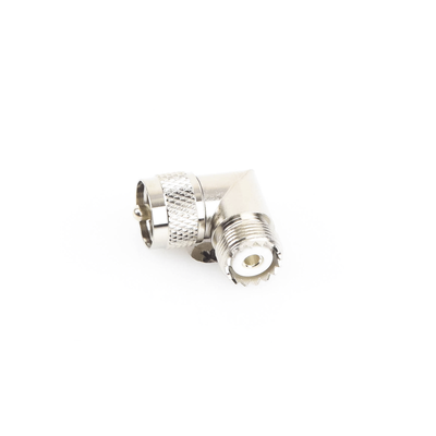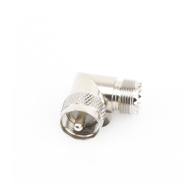 Adaptador en ángulo recto RFU-532 UHF macho PL-259 a UHF hembra SO-239 Cuerpo niquelado Contacto central plateado Diseño para espacios reducidos Conectores UHF para RF
