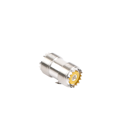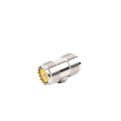 Adaptador barril RFU-536 UHF hembra en línea bronce niquelado contacto plateado aislante DAP. Conector UHF hembra (SO-239) en ambos extremos, tipo de adaptador barril, montaje en línea, cuerpo de bronce niquelado, y contacto central plateado. Ofrecen conexiones seguras y estables.