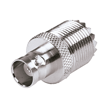 Adaptador UHF Hembra (SO-239) a BNC Hembra, Niquel, Plata, Delrin.