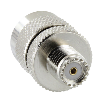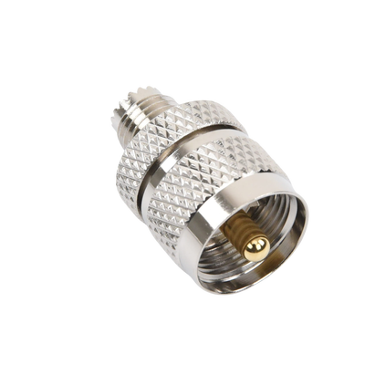 Adaptador en línea RFU-626 Conector Mini UHF Hembra a UHF Macho PL-259. Cuerpo de bronce niquelado, contacto de oro y aislante de teflón garantizan una conexión estable. Fácil instalación y durabilidad superior hacen de este adaptador una elección ideal para entusiastas de la radiocomunicación.