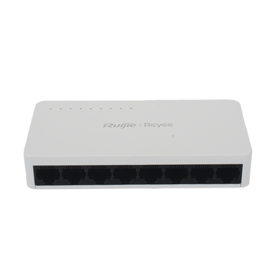 Switch de red RG-ES08G-L con 8 puertos a 10/100/1000 Mbps, capacidad switching de 11.9 Gbps y forwarding rate de 16 Mpps. Este modelo no administrado es ideal para montaje en escritorio o charola en rack, cuenta con funciones avanzadas y es plug %26 play, ofreciendo una solución de videovigilancia eficiente y segura.