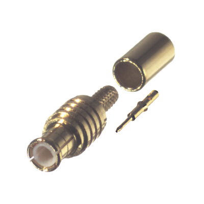 Conector MCX RMX-8000-1B tipo macho de bronce oro con anillo plegable y aislamiento en teflón. Especialmente diseñado para cable RG-174/U, garantiza una conexión segura y confiable. Ideal para aplicaciones de telecomunicaciones y fácil de instalar.