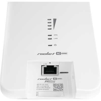 Radio estación base RP-5AC-GEN2 500 mbps 5 ghz 1 puerto 10/100/1000 mbps tecnología airprism resistencia EMI. Cuenta con 1 puerto de datos 10/100/1000 Mbps, 2 conectores RP-SMA para antenas externas, un sistema operativo airOS® 8, alimentación de 24 VDC y temperaturas de operación de -40 a 80° C. Además, ofrece ancho de canal ajustable y configuración rápida mediante Wi-Fi.