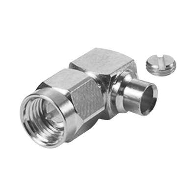 Conector SMA Macho en Ángulo Recto para Cable Semi-Rigido de 0.141' de Diámetro, Níquel/ Oro/ Teflón.