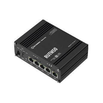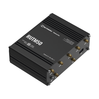 Router celular 5G RUTM50 de TELTONIKA, con velocidades de hasta 3.4 Gbps y Wi-Fi dual MU-MIMO. Fabricado en aluminio, es compacto y resistente a temperaturas extremas. Ofrece PoE pasivo y conexión para 4 dispositivos a 10/100/1000 Mbps, facilitando una instalación simplificada y un acceso constante a redes de alta velocidad.