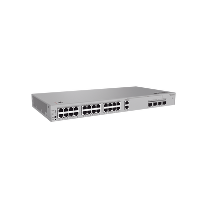 Switch de acceso S220S-26PN4JX de HUAWEI, ideal para redes empresariales. Cuenta con 22 puertos PoE+ Gigabit, 2 puertos PoE+ 2.5 Gbps y refrigeración por aire. Diseño robusto en metal, con capacidad de 98 Gbps, sin costos de licenciamiento.