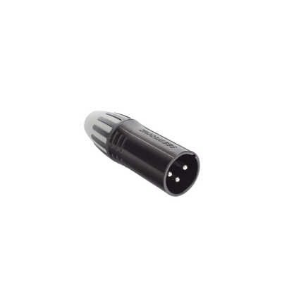 Conector XLR macho SCMM3-B con carcasa negra y contactos chapados en plata. Ideal para conectar equipos de audio. Incluye dos abrazaderas para diferentes diámetros, proporcionando versatilidad. Su diseño compacto y operación suave lo hacen perfecto para estudios y presentaciones en vivo.