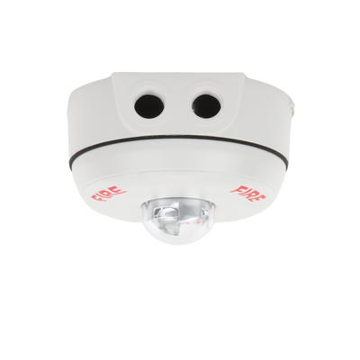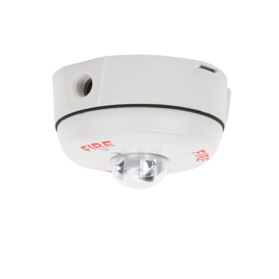 Lámpara estroboscópica SCWK de SYSTEM SENSOR, resistente a la intemperie NEMA 4X e IP56, listada en UL 1638. Ofrece configuraciones de candela seleccionables (15 a 185 candela) y es compatible con protocolo de sincronización System Sensor. Su diseño permite un montaje en techo fácil y rápido, ideal para aplicaciones exteriores donde la durabilidad es esencial.