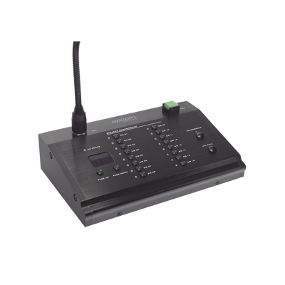 Micrófono 16 zonas SF-6200RM de EPCOM PROAUDIO, ideal para sistemas de megafonía. Soporta 16 zonas y permite hasta 32 micrófonos en cascada. Cuenta con 1 entrada y salida de audio, sensibilidad de 10mV/600Ω y un rango de frecuencia de 200Hz a 10KHz. Su diseño compacto de 256 x 52 x 149mm lo hace perfecto para diversas aplicaciones.