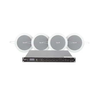 Kit de amplificador 120W SF120DTB/4CS 120W RMS con 4 altavoces de 4in. Incluye un sistema 70/100V, Bluetooth, 4 entradas de micrófono, y es ideal para espacios comerciales. Proporciona sonido de calidad.