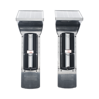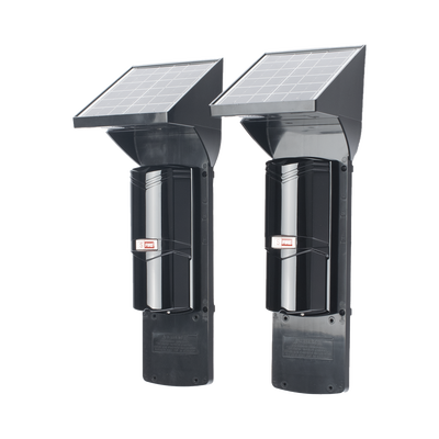 Detector fotoeléctrico SFA60 de SFIRE con 2 rayos infrarrojos, alcanza hasta 120 m en interiores y 60 m en exteriores. Alimentado por un panel solar y batería recargable de 4000 mAH para mayor durabilidad. Su diseño exclusivo evita falsas alarmas generadas por lluvia y nieve, mientras permite la sincronización perfecta entre transmisor y receptor. Ideal para ambientes sin electricidad y fácil de instalar en poste o pared.
