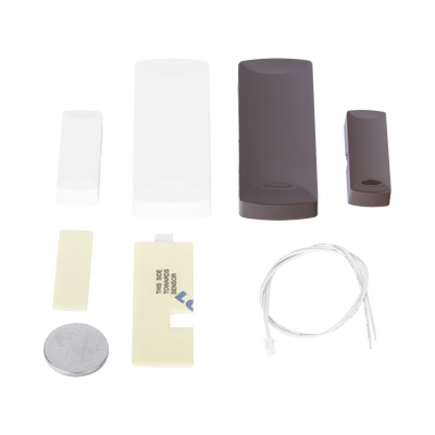 Contenido Contacto magnético inalámbrico con entrada zona externa, Iman, Batería 3V Litio Modelo CR2032, Carcasa marrón intercambiable, Arnés para zona externa