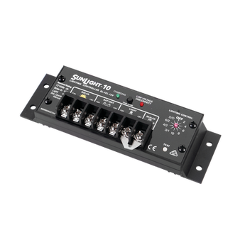 Controlador solar SL-10L-12V de la marca MORNINGSTAR, ideal para sistemas de iluminación exterior. Cuenta con un selector digital para 10 opciones de iluminación, determina el ciclo día/noche usando voltaje solar, y garantiza encendido automático al anochecer y apagado al amanecer. Este controlador facilita el ahorro de energía solar, permitiendo personalizar la iluminación según tus preferencias.