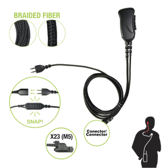 Micrófono con cable SNP-1W-23-BF de fibra trenzada, con conector SNAP de dos pines y clip con PTT rotación 360 grados. Suave al tacto, resistente a enredos, proporciona audio de alta calidad y aumenta la durabilidad del cable.
