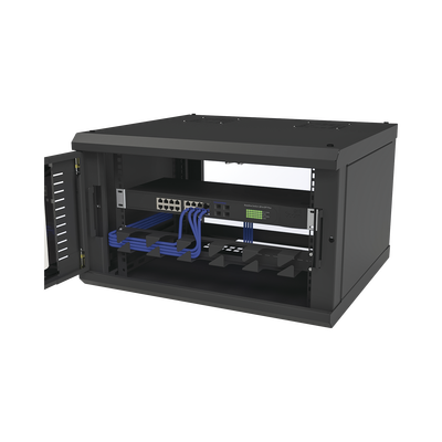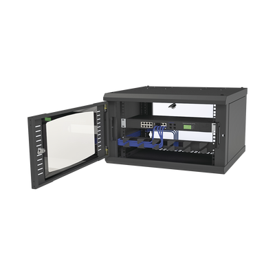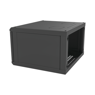 Gabinete de pared SR-1906-GFP 6 unidades de rack 600 x 354 x 535 mm con puerta de cristal templado y laterales desmontables. Ideal para instalación en pared, este gabinete facilita la visualización interna con su ventana de cristal templado, optimiza el espacio en entornos reducidos, cuenta con un sistema de seguridad en la puerta, y permite un ajuste flexible de los postes racks.