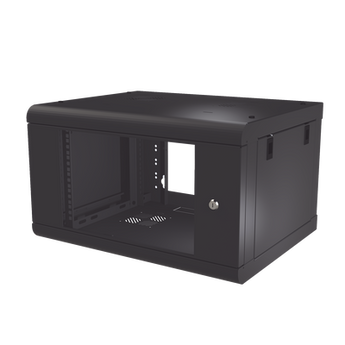 Gabinete de pared SR-1906-LH2G, 606 x 353 x 479.5 mm, 80 kg, acero negro, puerta de cristal templado, instalación en pared, puertas laterales desmontables. Ideal para sistemas de redes, este gabinete de 6U combina seguridad y facilidad de uso con su chapa de seguridad y flexibilidad en la gestión del equipo.