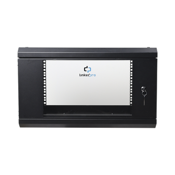 Gabinete de pared SR-1906-LH3G, 603x355x455 mm, 6 unidades, 80 kg de carga, puerta de cristal templado y laterales desmontables. Este gabinete negro semi mate está fabricado en acero de primera calidad y permite una instalación en pared con fácil gestión del cableado, ideal para sistemas de redes y servidores.