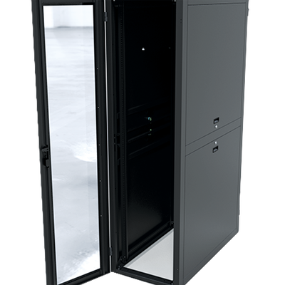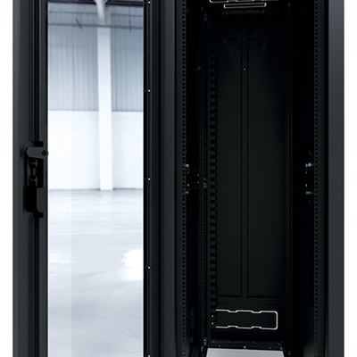 Gabinete profesional SR-1980-GAD de 45 unidades rack 600x2125x1200 mm y carga estática de 1360 kg. Con puerta frontal de vidrio de seguridad y trasera de acero desmontable, laterales desmontables para fácil acceso, mejor ventilación y compatibilidad con equipos estándar de 19%22. Facilita la instalación y la seguridad de los equipos.