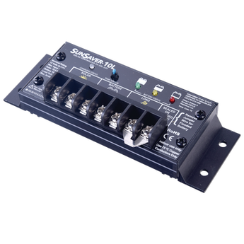Controlador de carga Sunsaver SS-20L-12V encapsulado para protección en humedad, incluye indicador de carga LED verde, bajo voltaje con LED rojo, compensación de temperatura, aprobado para lugares peligrosos y con garantía de 5 años. Ideal para ambientes marítimos y conexiones en paralelo para mayor flexibilidad.