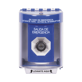 El Botón de Salida de Emergencia SS2-473-EX-ES de STI en color azul presenta una bocina integrada y un diseño curvo único que evita activaciones accidentalmente. Su cubierta de policarbonato resistente, con propiedades de trabajo de -40° a 250°F (-40° a 121°C), lo hace ideal para cualquier ambiente. Incluye la frase %22SALIDA DE EMERGENCIA%22 en español y es listado en UL/cUL.