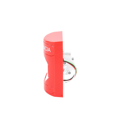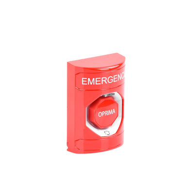 Botón de emergencia SS2009EM-ES color rojo, acción de empuje y vuelta. Ideal para interiores y exteriores, con texto en español y garantía de tres años. Carcasa de policarbonato resistente y placa posterior de acero inoxidable. Cumple con normativa ADA y diseño que previene activaciones accidentales.