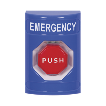 Botón de emergencia SS2405EM-EN de STI en policarbonato resistente azul con bocina de advertencia integrada que presenta la frase EMERGENCY EXIT. Dispone de cubierta protectora y temporizador ajustable neumático, ideal para prevenir la activación accidental gracias a su diseño curvo único.