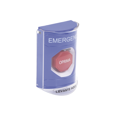 Botón multipropósito SS24A2EM-ES Color azul, 2 relevadores tipo C 10A 125/250VCA, tapa de policarbonato super resistente. Diseñado para interiores, con bocina de advertencia y llave para restablecer. Ideal para entornos críticos y situaciones de emergencia, previene activaciones accidentales gracias a su diseño curvo, cumpliendo normativas de seguridad y accesibilidad.