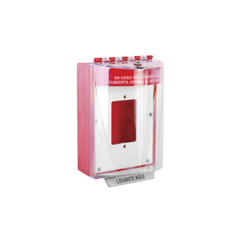 Cubierta universal STI-13510FR-ES de policarbonato para interior/exterior con protección contra vandalismo y resistencia a daños. Dimensiones: 5,95%22 altura x 4%22 ancho x 2,18%22 profundidad. Montaje en superficie, etiqueta de protección contra incendios y bisagra de alta resistencia. Ideal para estaciones manuales de emergencia.