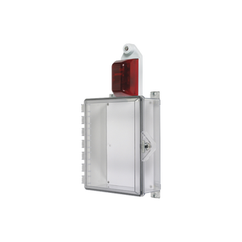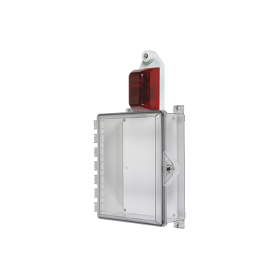 Gabinete pequeño STI-7525 con sirena roja de hasta 100 dB y cierre manual. Ofrece hasta 32 tonos seleccionables, temporizador ajustable y es alimentado por batería o externo. Garantía de 3 años y resistente a temperaturas extremas de -40° a 250°F.