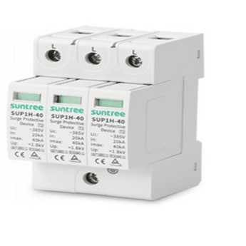 Supresor de picos SUP1H-40/220VAC/3P, 3 polos, IP20, diseñado para sistemas fotovoltaicos. Ofrece resistencia de -40° a +80°C y montaje en riel DIN de 35 mm. Tiene tiempo de respuesta menor a 20 ns y soporta cables de 4~16 mm².