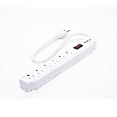 Multicontacto SYS-136221 de la marca SURTEK, diseñado para ofrecer protección contra sobretensiones. Con una tensión nominal de 127 Vca, 6 salidas NEMA 5-15R, un interruptor iluminado y un tiempo de respuesta menor a 1 nanosegundo, permite conectar múltiples dispositivos de forma segura y eficiente. Ideal para uso en interiores.