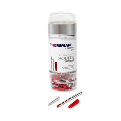 Juego de fijación TH-KITTP de THORSMAN, ideal para concreto y tabique. Temperaturas de operación: -50ºC a +80ºC. Carga recomendada: 60 kg (concreto), 50 kg (tabique). Incluye 30 taquetes rojos de 1/4%22 y 30 tornillos de 10 x 1 1/2%22. Doble expansión hacia los cuatro puntos cardinales y cuello que evita el hundimiento del taquete.