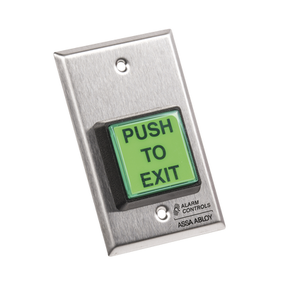 Botón de salida TS2 10A 35VDC iluminado por LED con diseño robusto. Placa de acero inoxidable, pulsador cuadrado verde de 2%22, interruptor de acción momentánea, contactos soportan 10A a 35VDC/120VAC, y profundidad de 2-1/2%22. Ideal para emergencias y fácil acceso gracias al pulsador iluminado.