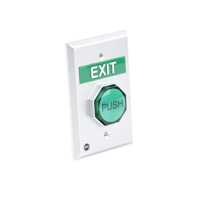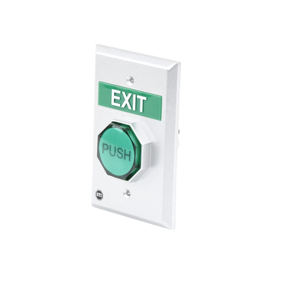 Botón de salida UB-1, dimensiones 82 x 123 x 56 mm, LED blanco (12/24 voltios). Pulsador momentáneo con más de 300 combinaciones. Listado por UL a normas de seguridad de EE.UU. y Canadá, y garantía de 3 años contra rotura del policarbonato durante el uso normal.