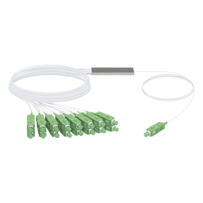 Divisor óptico UF-SPLITTER-16 modelo UFiber con conectores SC/APC, diseñado para instalaciones de telecomunicaciones. Este divisor de fibra ofrece 16 salidas, es compatible con UFiber OLT y ONU, permitiendo un transporte eficiente de datos a larga distancia y un diseño eficiente para despliegues de red.