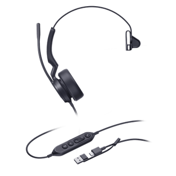 Diadema alámbrica UH44-MONO-TEAMS-USB-C/A, cable 0,65 m, micrófono 100 Hz a 14 kHz. Cancelación de ruido con 2 micrófonos + AI y altavoz de 35 mm. Proporciona comodidad durante largos períodos de uso gracias a su diseño ergonómico.