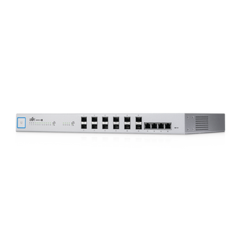 Switch de red US-16-XG de UBIQUITI, con 12 puertos SFP+ 10 Gbps y 4 puertos RJ45 10 Gbps. Dimensiones de 443 x 221 x 43 mm y un peso de 2.67 kg. Total Non-Blocking Line Rate de 160 Gbps y un Forwarding Rate de 238.10 Mpps. Optimizado para máxima velocidad y baja latencia, facilitando la implementación de redes de alta velocidad y conectividad confiable.