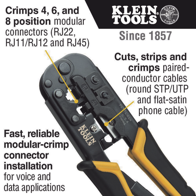 Pinzas para terminación VDV226-011-SEN corta pela poncha conectores modulares de 4 6 8 posiciones compatible con cables 28-22 awg agarres moldeados amarillos y negros liberación de seguridad matrataca