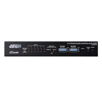 Interfaz de audio VE66DTH de la marca ATEN, con 6 entradas y salidas HDMI, que admite audio sin comprimir de 24 bits seleccionable hasta 96 kHz. Incorpora un preamplificador de micro equilibrado de +40 dB y alimentación Phantom de 48V. Su construcción metálica compacta asegura durabilidad en entornos profesionales.