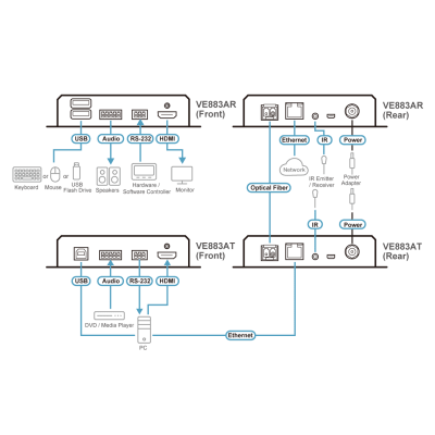 1x transmisor óptico VE883T 4K HDMI, 1x receptor óptico VE883R 4K HDMI, 2x adaptadores de corriente, 2x bloques de terminales con 3 polos, 2x bloques de terminales con 5 polos, 1x receptor de infrarrojos, 1x emisor de infrarrojos, 1x cable USB, 2x HDMI LockPro, 2x módulos SFP, 1x manual de instrucciones