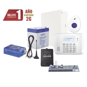 El kit incluye Panel de alarma con teclado 6162RF, comunicador con antena MINI012G, botón de pánico SFWSTFALL, transformador RT1640LS y batería PL4.512