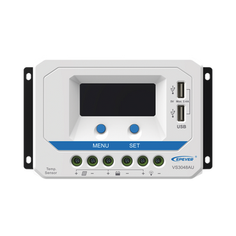 Controlador solar VS-3048-AU 12/24/36/48 V 30 A con doble salida USB y pantalla LCD. Es un controlador de carga inteligente PWM, conexión a tierra positiva común, cuenta con múltiples modos de control de carga y ofrece amplia protección electrónica. Ideal para cargar dispositivos USB de forma eficiente y muy fácil de usar.