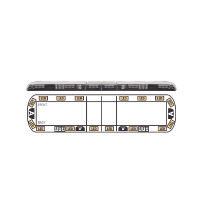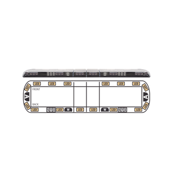 Configuración: 16 módulos con 3 leds c/u en color Ámbar, 2 luces de trabajo  con 3 leds c/u en cólor claro, 2 módulos traseros de alto, reversa y direccionales  con 3 leds c/u en color rojo, blanco y ambar, director de tráfico.